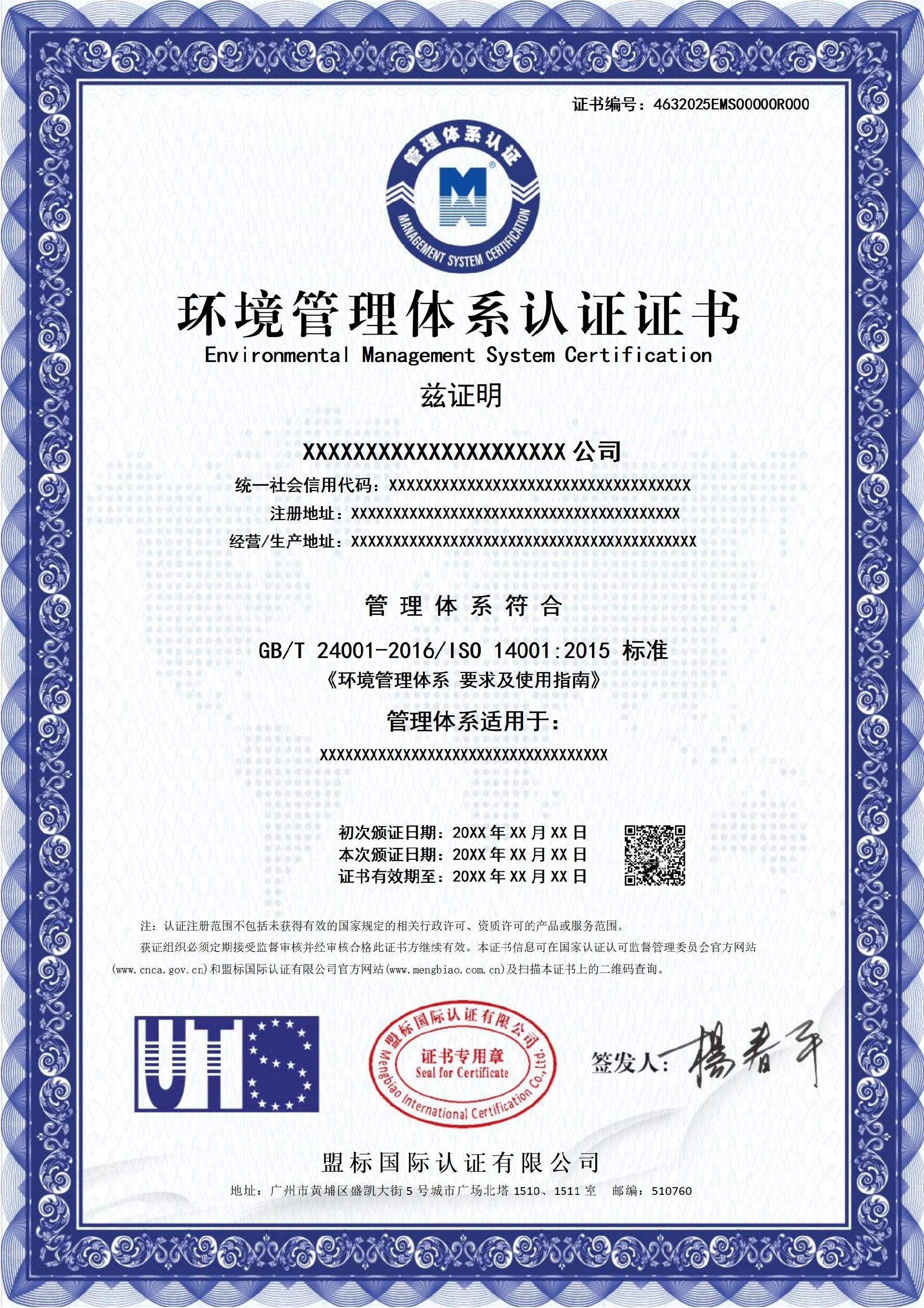 環(huán)境管理體系認(rèn)證證書——中文版證書