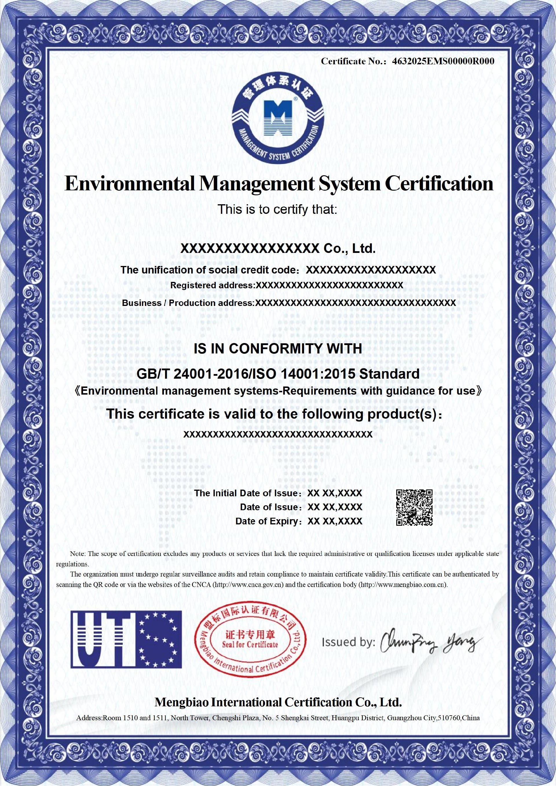 環(huán)境管理體系認(rèn)證證書——英文版證書