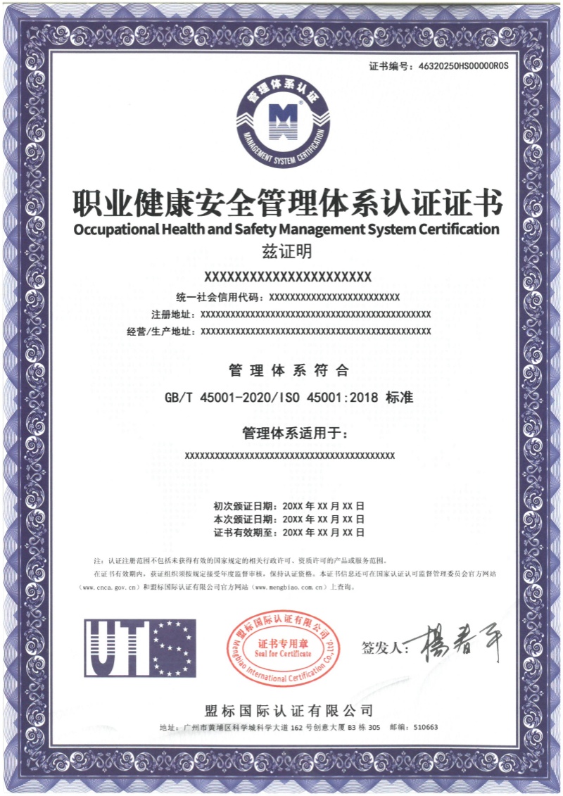 職業(yè)健康安全管理體系認(rèn)證證書——英文版證書