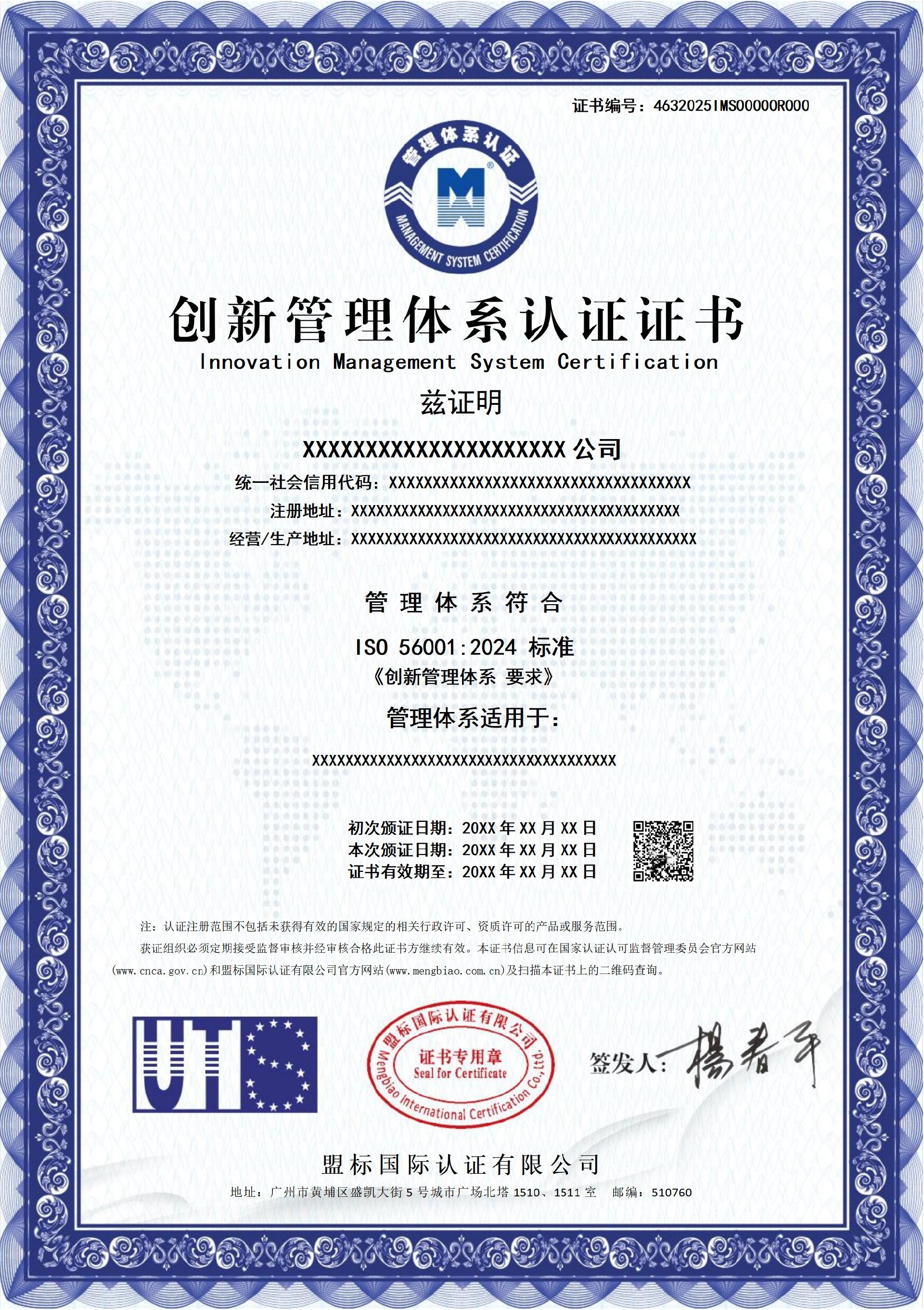 創(chuàng)新管理體系認(rèn)證證書(shū)-樣版
