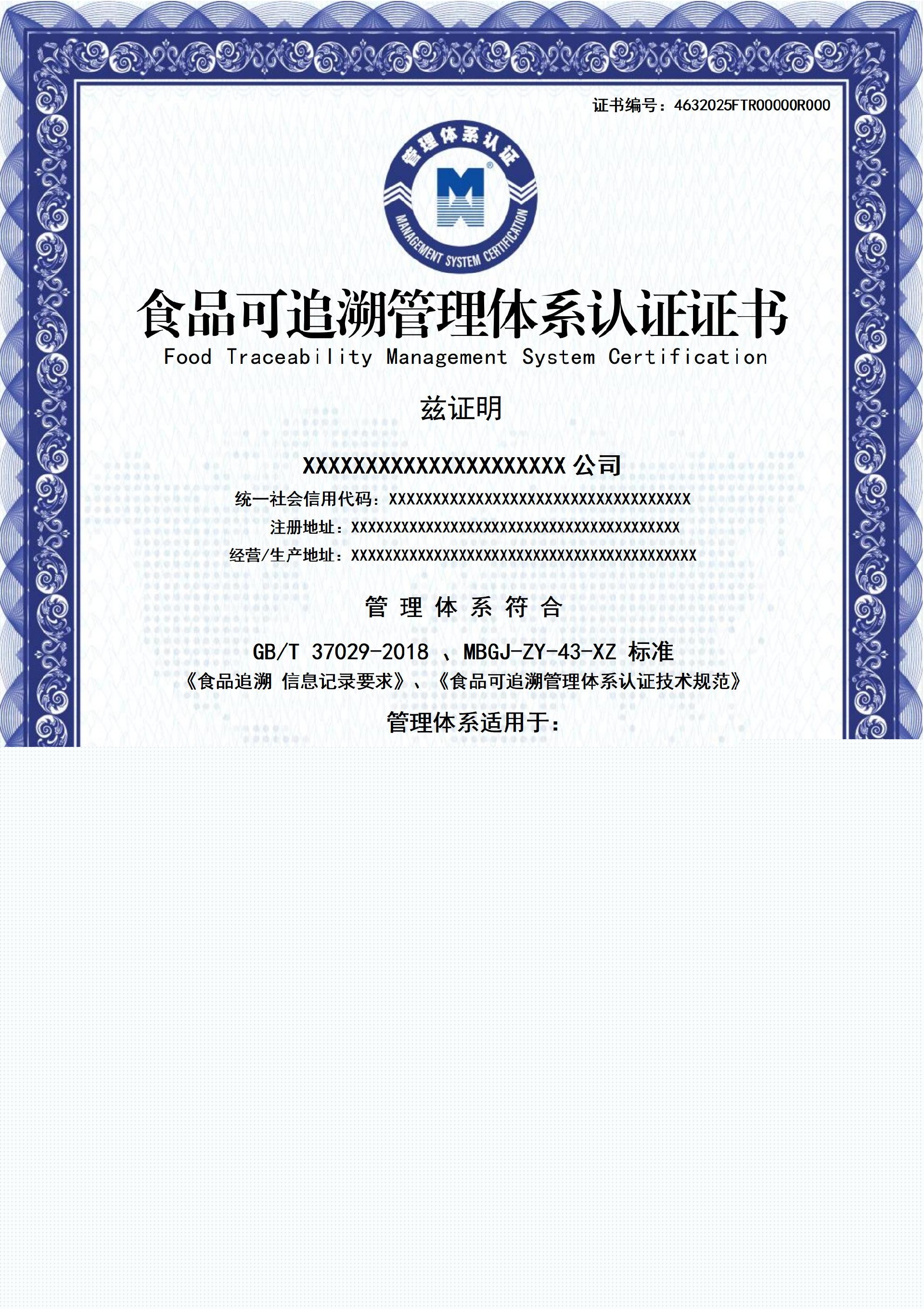 食品可追溯管理體系認(rèn)證證書(shū)-樣版