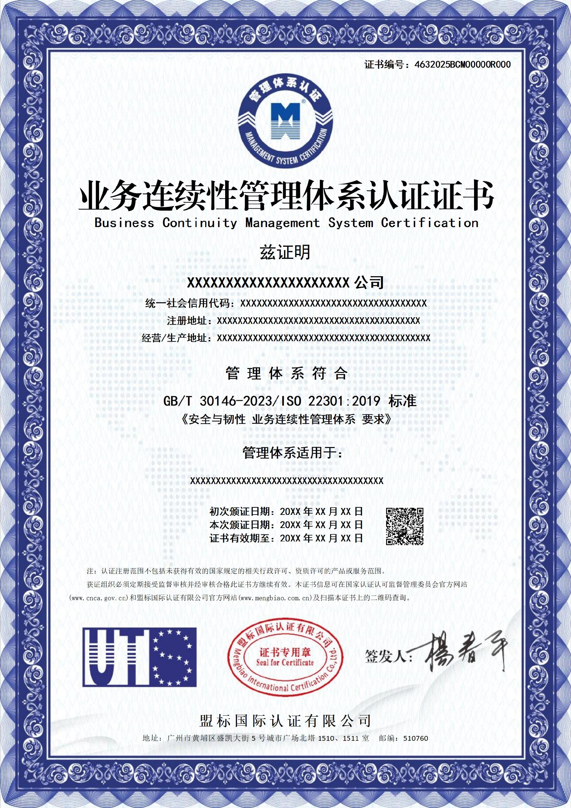 業(yè)務(wù)連續(xù)性管理體系認(rèn)證證書(shū)-樣版