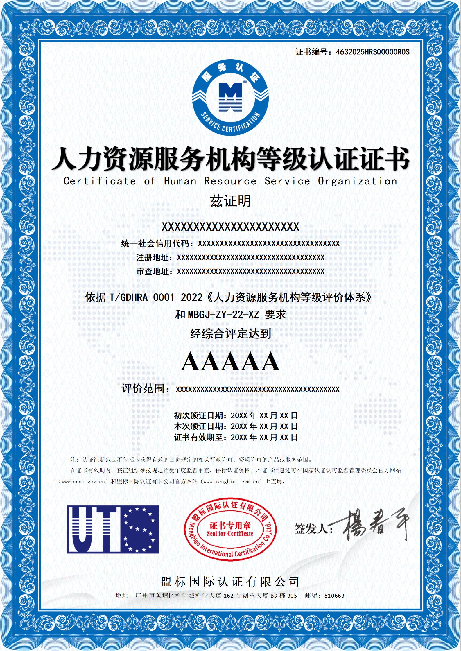 人力資源服務機構等級認證證書-樣版
