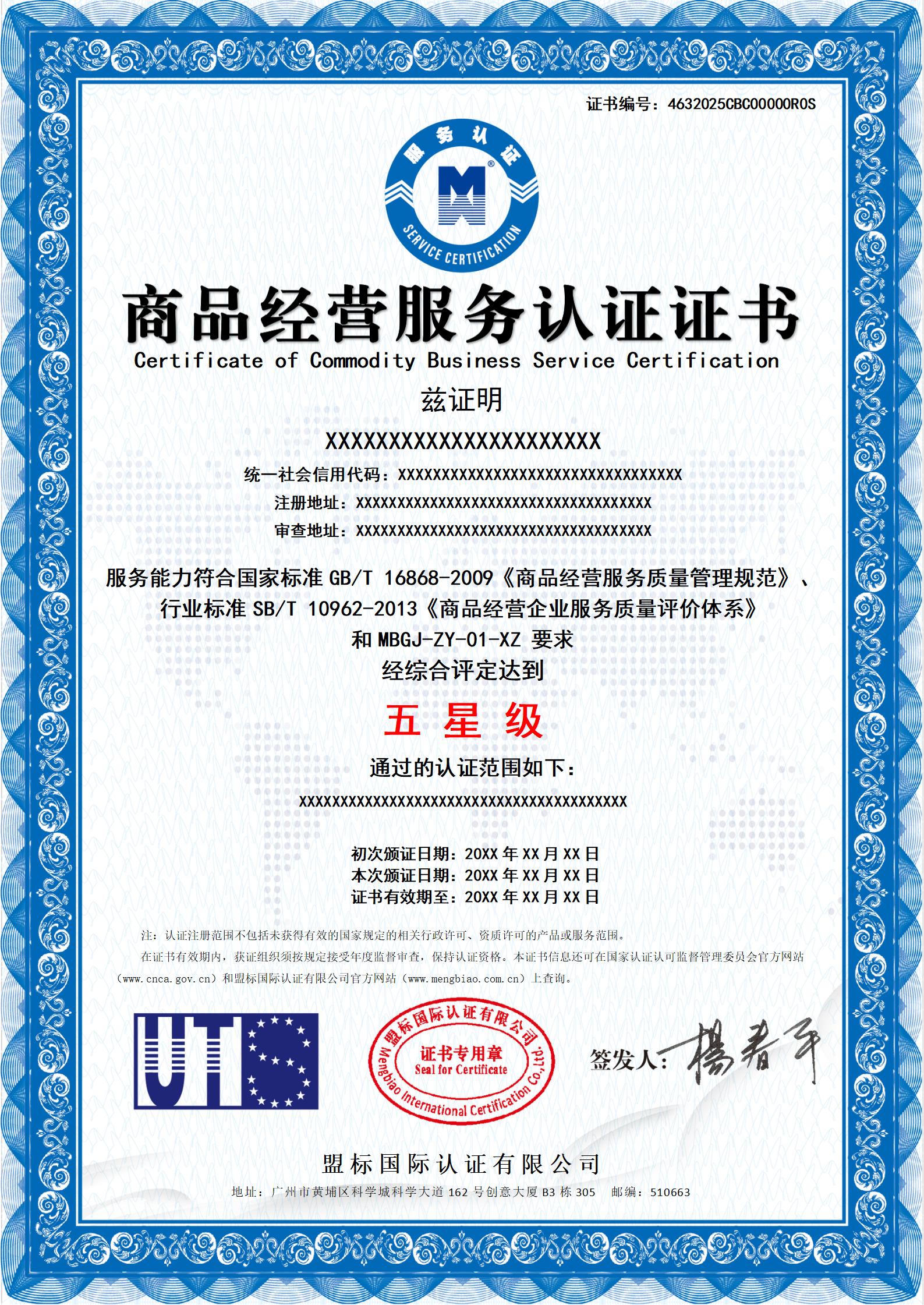 商品經(jīng)營服務認證證書-樣版