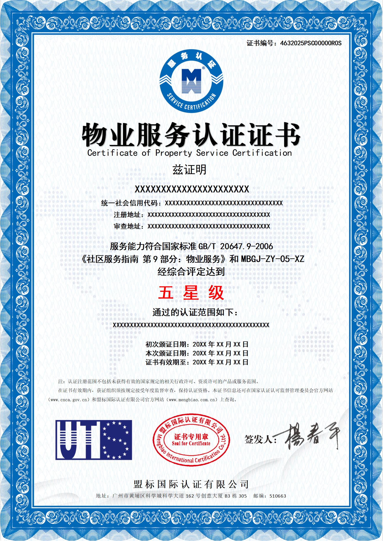物業(yè)服務認證證書-樣版