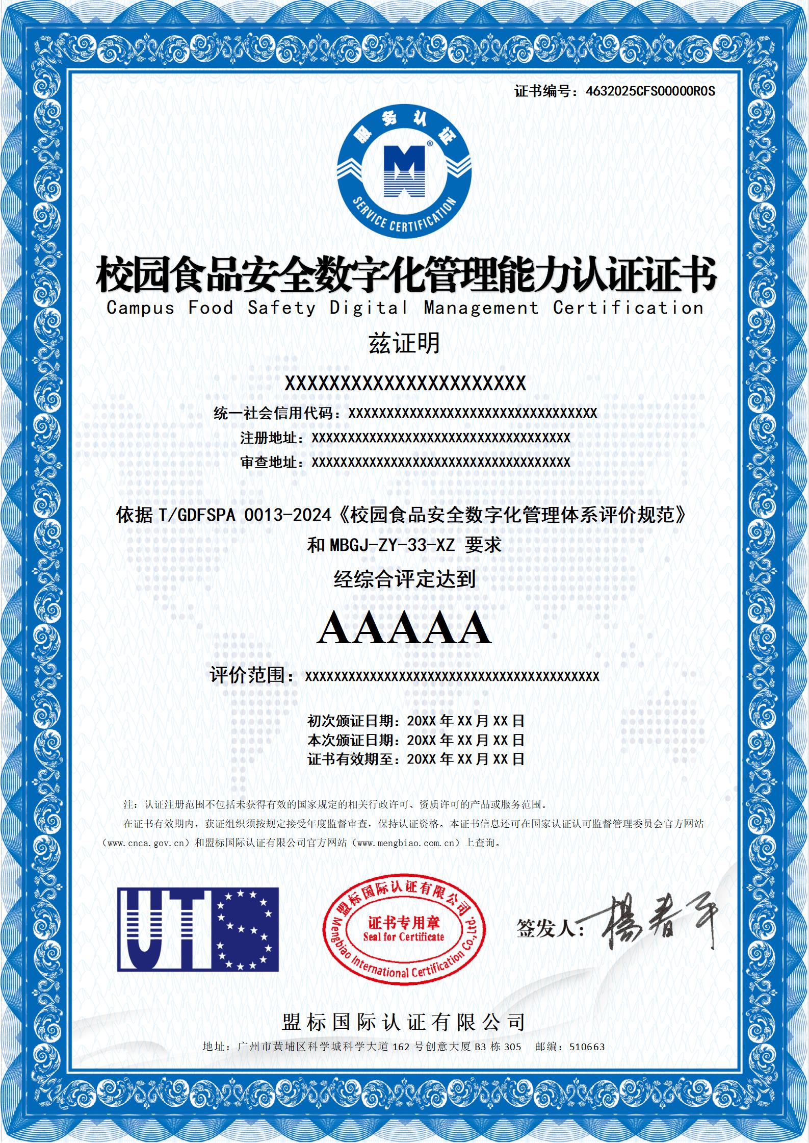 校園食品安全數(shù)字化管理能力認證證書-樣版
